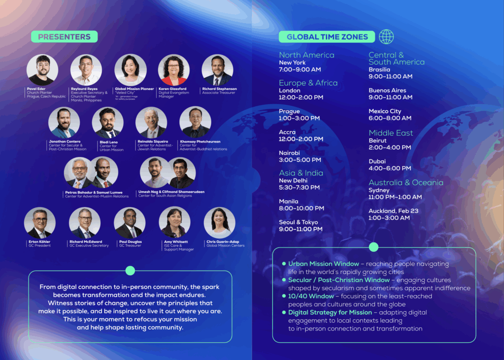 Maailmanlaajuinen adventtikirkko järjestää ilmaisen parin tunnin mittaisen MISSION REFOCUS -koulutuksen kaikille, jotka ovat kiinnostuneita käyttämään nykymediaa lähetystyövälineenä. Koulutus tapahtuu netissä su 22.2. klo 14 Suomen aikaa. Mukaan englanninkieliseen koulutukseen voi ilmoittautua osoitteessa https://missionrefocus.org/